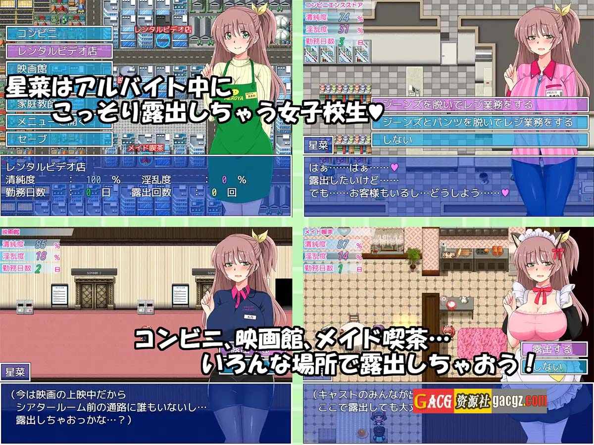 游戏中,玩家的主要任务是通过打工来赚取游戏货币,同时在打工的过程中与女同学互动。游戏中的“露出”元素贯穿始终,玩家需要在特定场景中触发角色的特殊服装或状态,增加游戏的趣味性和视觉体验。